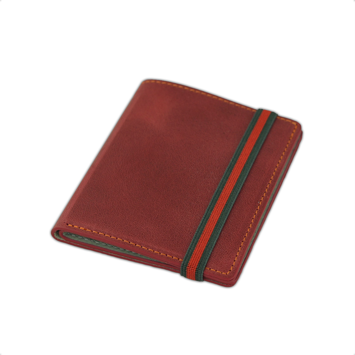 La Cartera Cardinal Green es una cartera de piel de vacuno 100% hecha a mano de máxima calidad. Con un diseño extra delgado, el exterior de color rojo oscuro, y con una banda elástica verde y roja para cerrar la cartera y asegurar el contenido del dinero y las tarjetas de crédito. Permite en su interior hasta 12-14 tarjetas y dispone de un espacio lateral en el que guardar tus billetes.